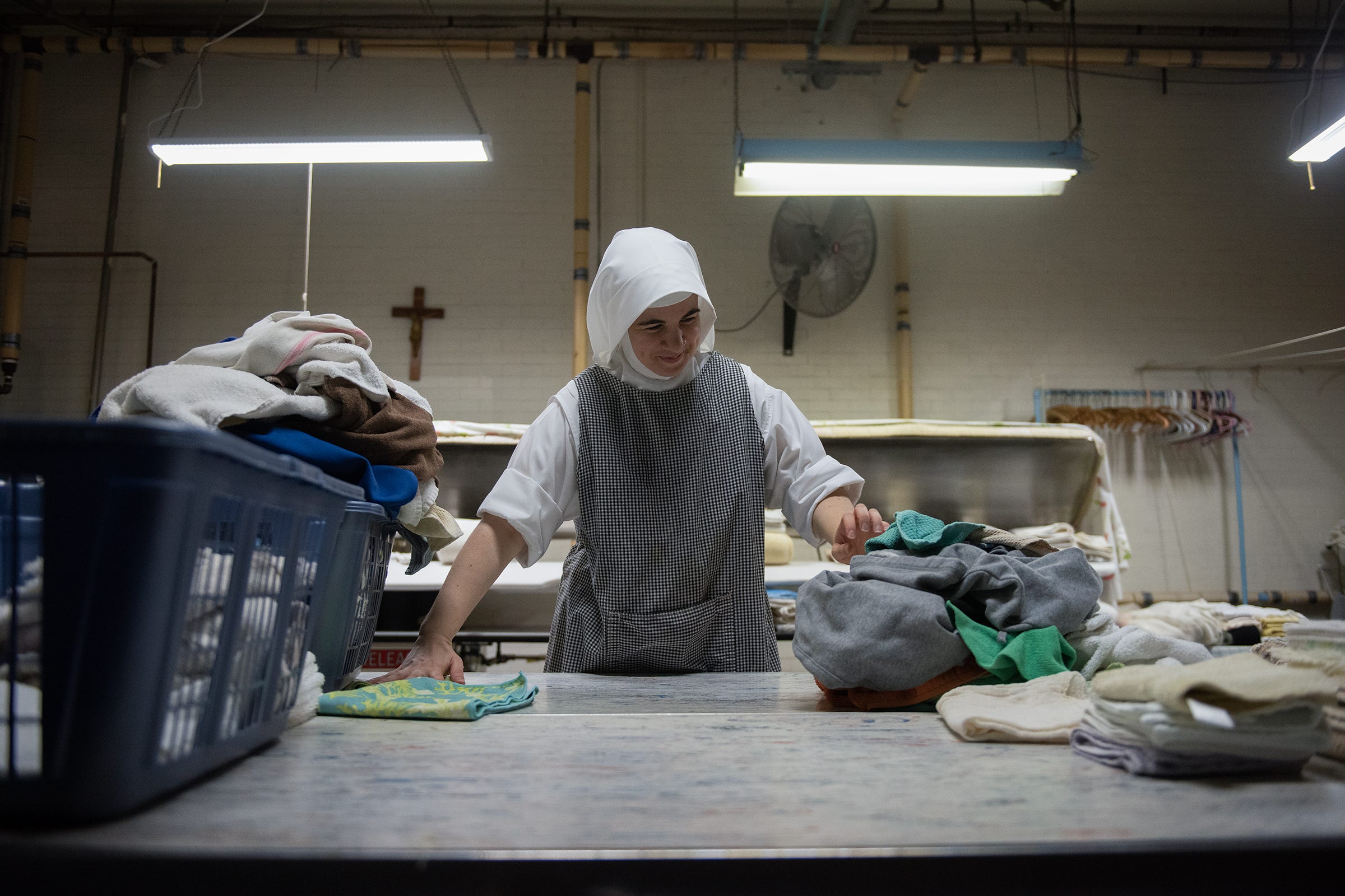 Over roughly five years, I photographed what almost no one outside ever sees: work time in the laundry and kitchen, sisters hunched over sewing projects, recreation with games and laughter, the quiet intensity of prayer in choir. I was present for first vows and solemn vows, for the moment when a young woman lies prostrate on the floor and offers her entire life to Christ.