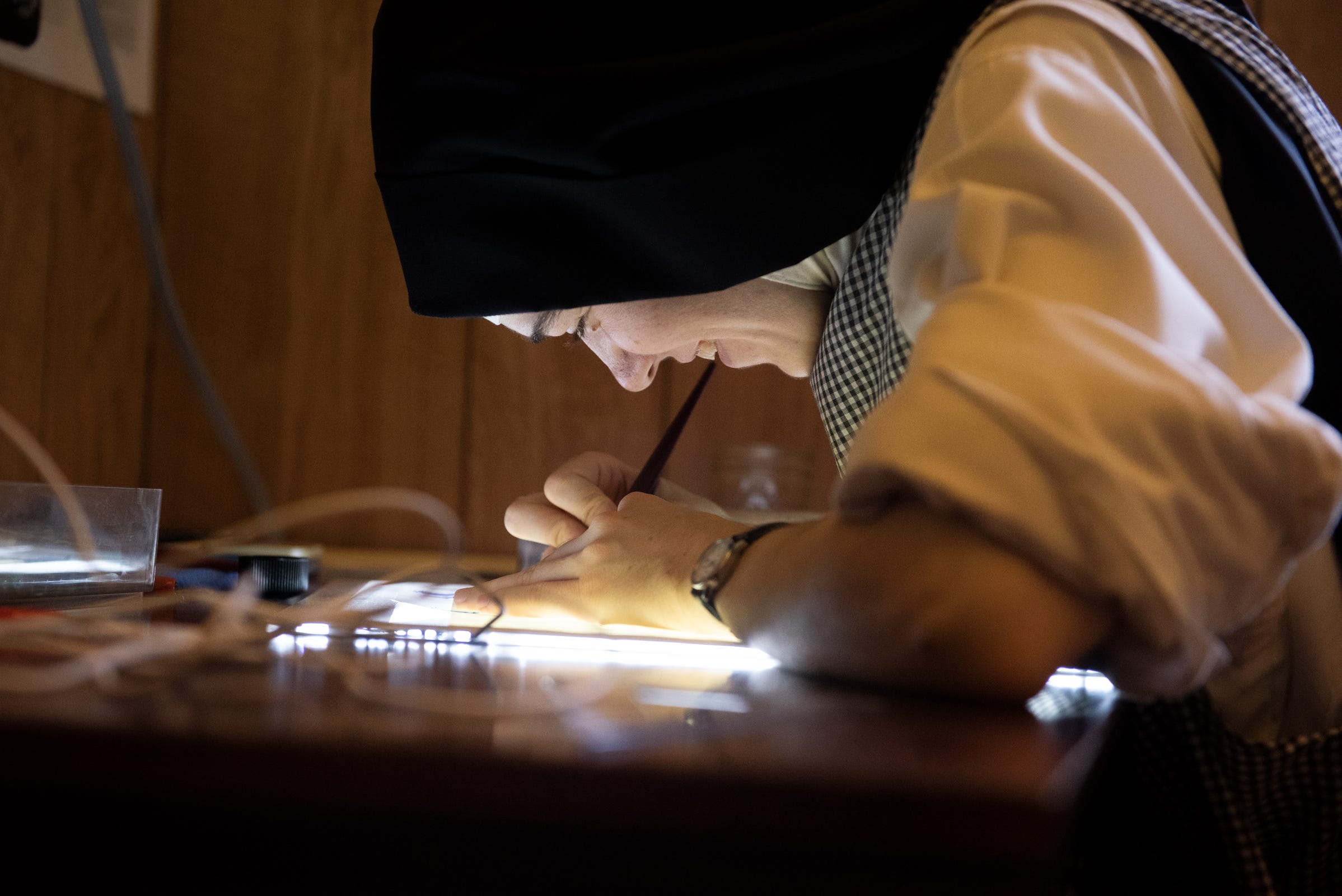 One afternoon, I was photographing Sr. Maria Lucia as she worked on calligraphy. She was bent over the page, serious, focused—the kind of concentration that makes you hold your breath so you don’t disturb it. I was close beside her, maybe too close, peering through the viewfinder.