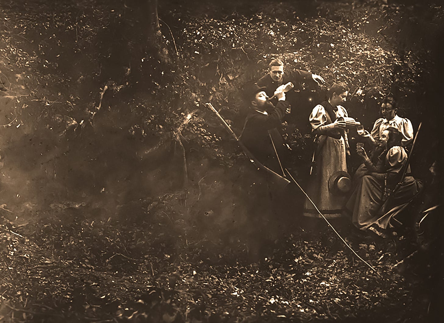 Through shadowed woods their steps they guide,